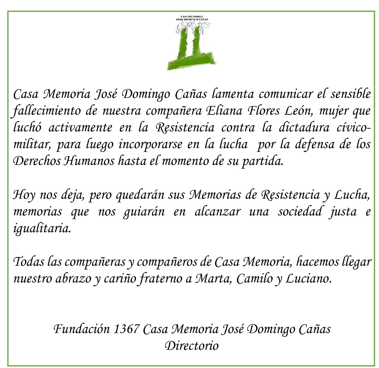 Estimades lamentamos comunicarles que ayer lunes 29 de junio falleció Eliana Flores madre de nuestra amiga y compañera Marta Cisterna.